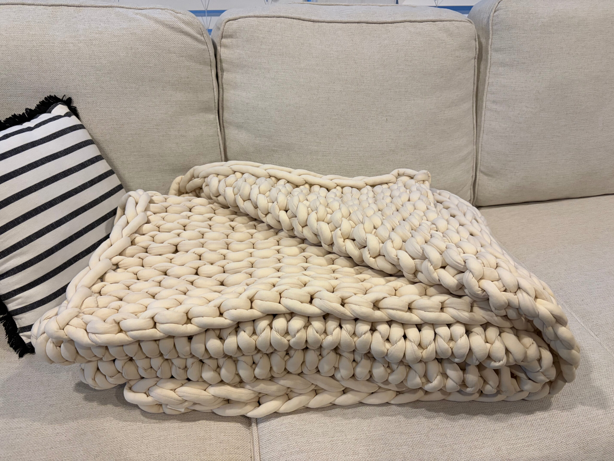 Including a cheaper option for a knit weighted blanket in my review was a last-minute decision. I don’t think spending $200 for something like this is crazy, but I am aware that cheaper options exist, so I felt compelled to try one. I chose Casaluna primary for the look, price and convenience of it being available at Target. I was uncertain about the smaller size but again, thought I’d try it – to see if a ”throw” option would work for me. This one is just too small (and doesn’t have the same quality or effect).